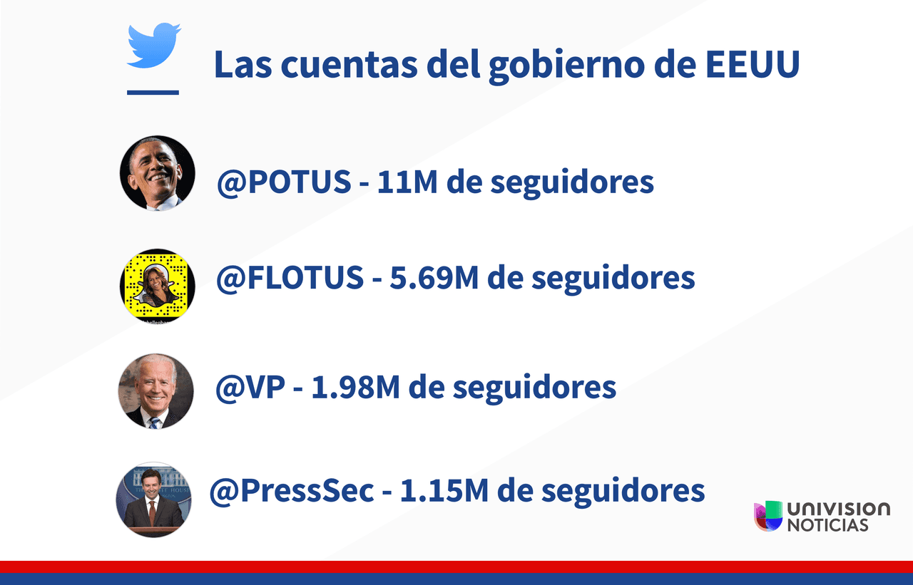 Igualmente ocurrirá con las cuentas de Instagram y Facebook. Archivos del contenido creado durante la administración de Obama vivirán bajo el nombre 'Obama White House' en ambas cuentas. Cuentas de la primera dama y el vicepresidente se mudarán a unas que se diferencian por tener "44" en el nombre.