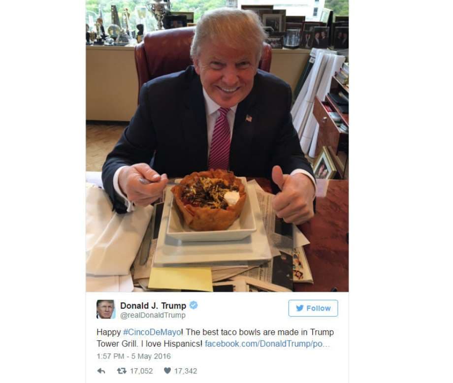 "¡Feliz #CincoDeMayo! Los mejores taco bowls se preparan en Trump Tower Grill. ¡Amo a los hispanos!", escribió el empresario.