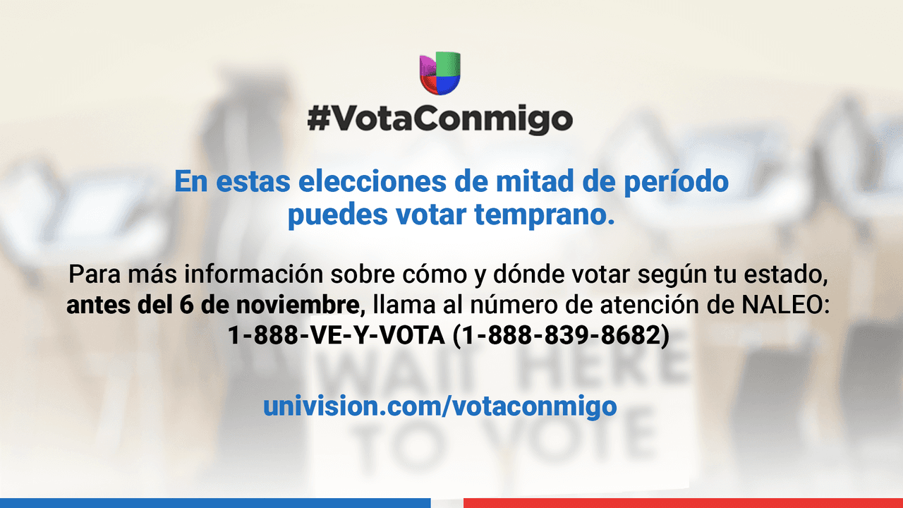 Para más información visita Vota Conmigo y Mi Familia Vota. También puedes llamar al número de NALEO, 1-888-VE-Y-VOTA (1-888-839-8682)