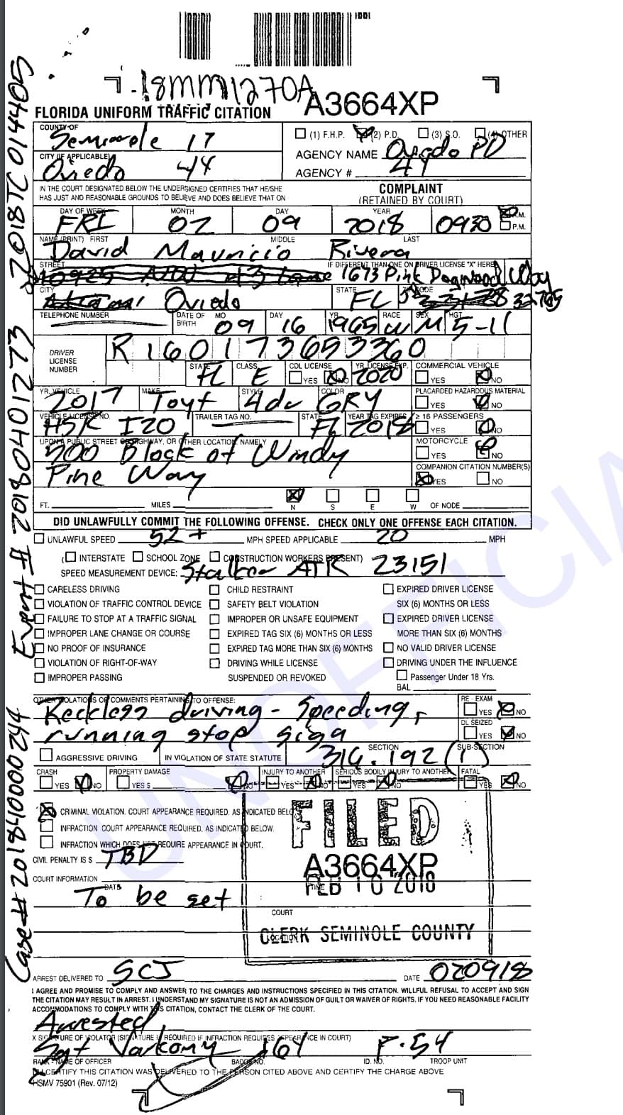 “Activé mi radar y observé que el vehículo aceleró de 45 mph a 52 mph en Windy Pine Way’’, escribió Varkoni en su reporte. “Seguí al vehículo que continuó acelerando para alejarse de mí a más de 60 mph’’, agregó.