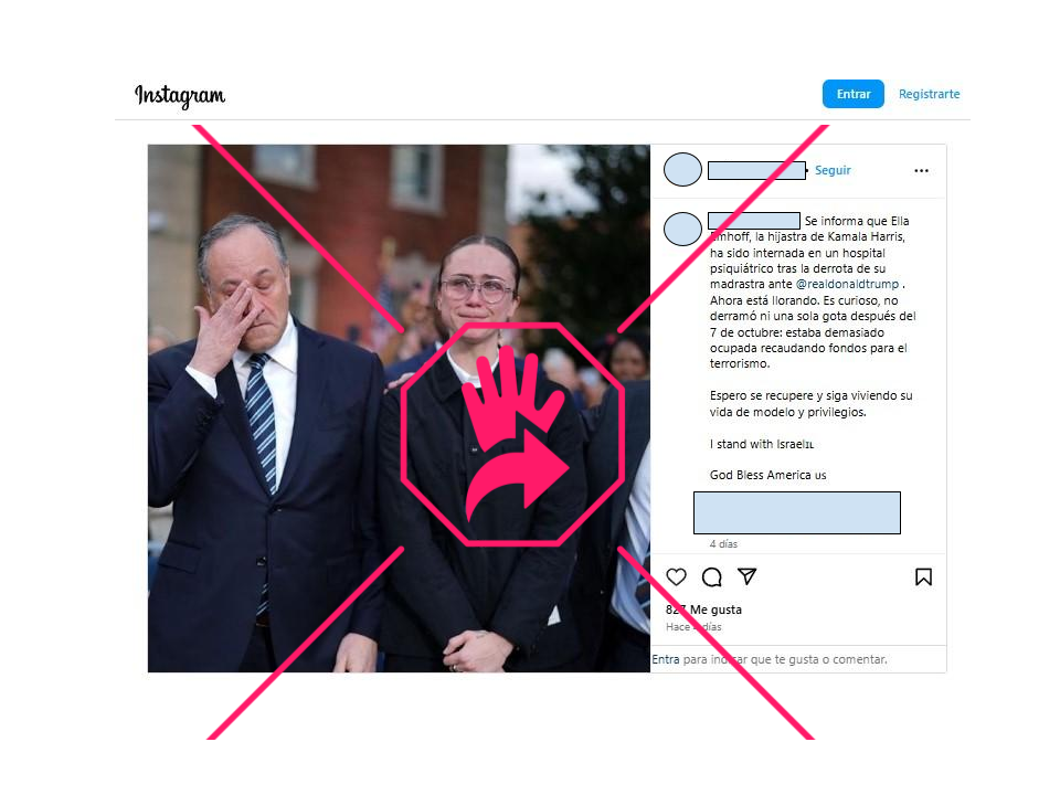 Es falso que la hijastra de Kamala Harris, la modelo y artista Ella Emhoff, haya sido internada en un hospital psiquiátrico tras “la derrota de su madrastra ante Donald Trump”, como afirma una publicación en Facebook. Diversas notas periodísticas recogieron la reacción de Ella Emhoff negando el supuesto colapso mental. Su madre, Kerstin Emhoff, también lo desmintió. Lee aquí cómo escogemos y asignamos nuestras etiquetas en elDetector.