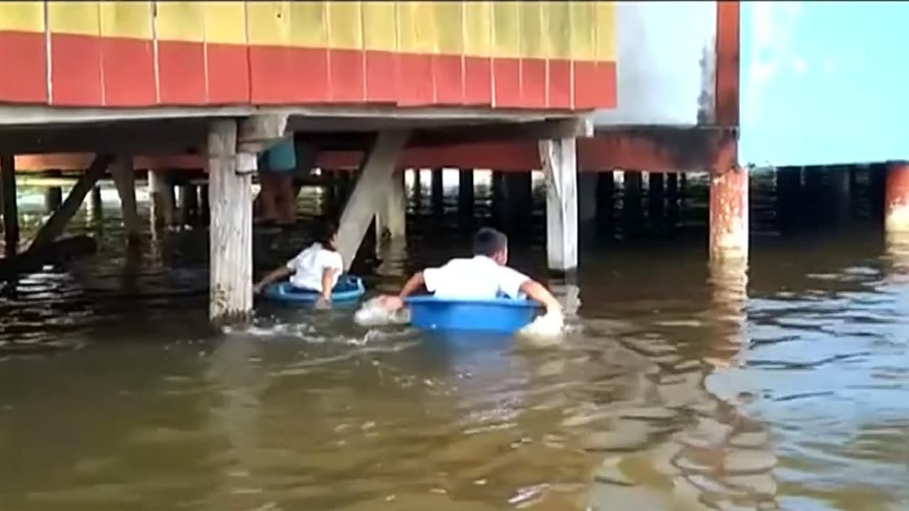 En cubetas, así "navegan" estos niños un río para poder ir a la escuela por la falta de recursos