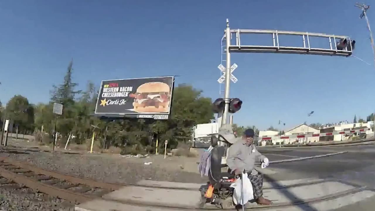 Un hombre en silla de ruedas intentaba atravesar el cruce de ferrocarril cuando quedó atascado en medio de la vía férrea. Gracias a la rápida acción de una mujer policía que llegó a tiempo para salvarlo, evitó ser atropellado por un tren que se aproximaba a toda velocidad.