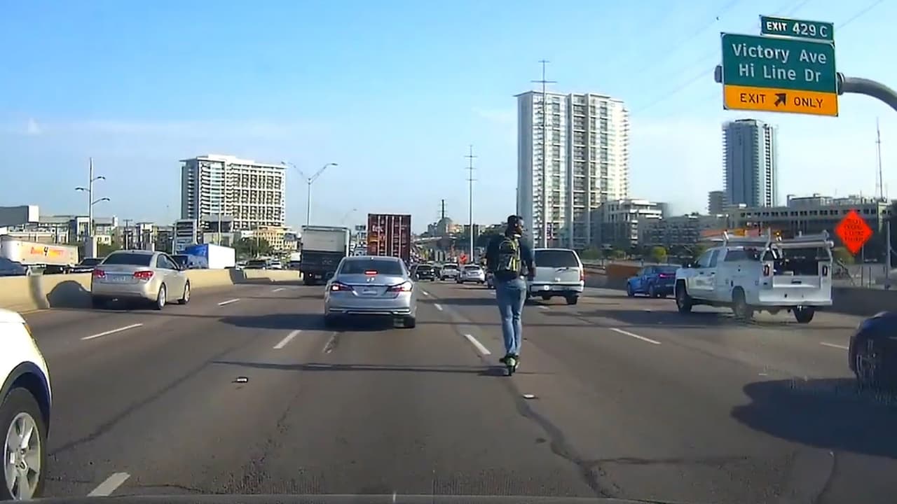 Sin poder poner los intermitentes pero sin ningún miedo, un joven cruzó con una patineta eléctrica los seis carriles de la autopista 35 de Dallas a primera hora de la mañana, en medio del tránsito de camiones y autos, ante la sorpresa de un conductor cuyo vehículo captó el momento.
