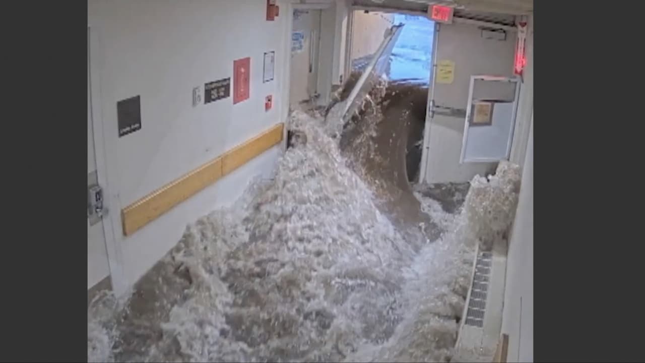 Imágenes muestran el instante en que las puertas del Hospital de Norwood, en Massachusetts, cedieron ante las fuerzas de las aguas, que irrumpieron en el edificio destrozando y arrasando con todo a su paso.
