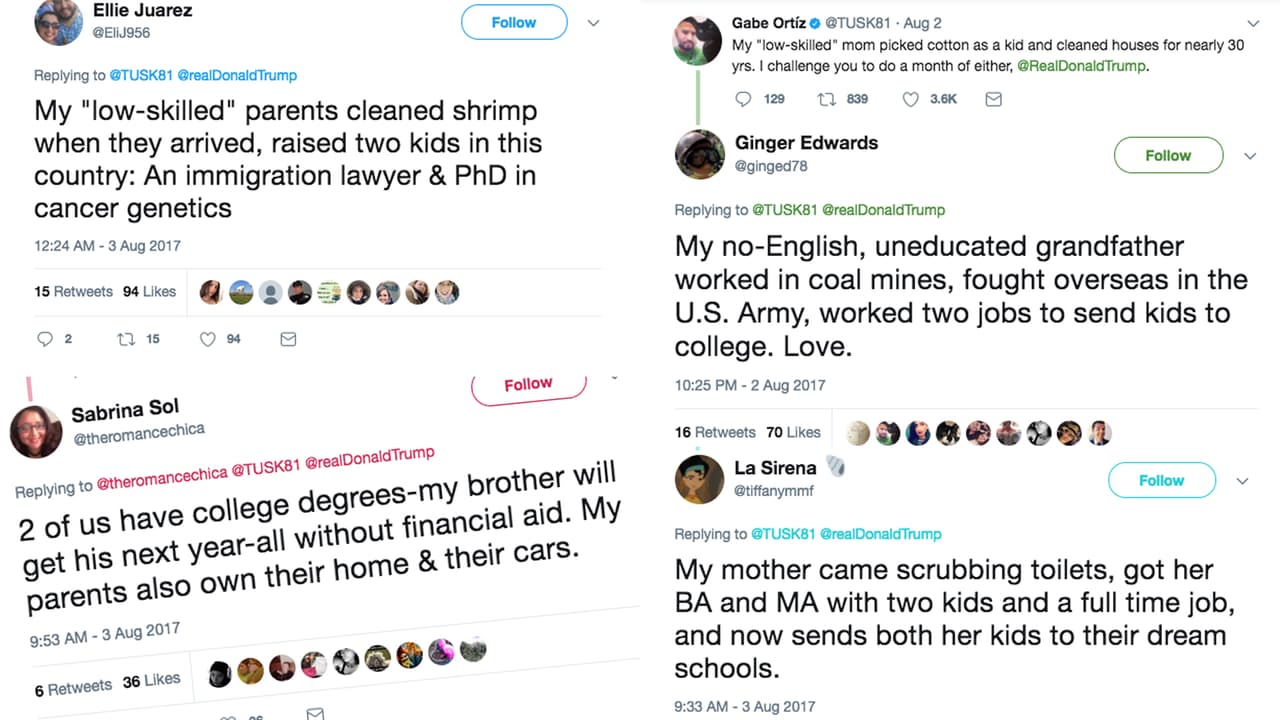 Centenares de usuarios de Twitter reivindicaron los trabajos de sus padres y abuelos para demostrar que no se necesita saber inglés para ser admitidos y aporta a Estados Unidos.