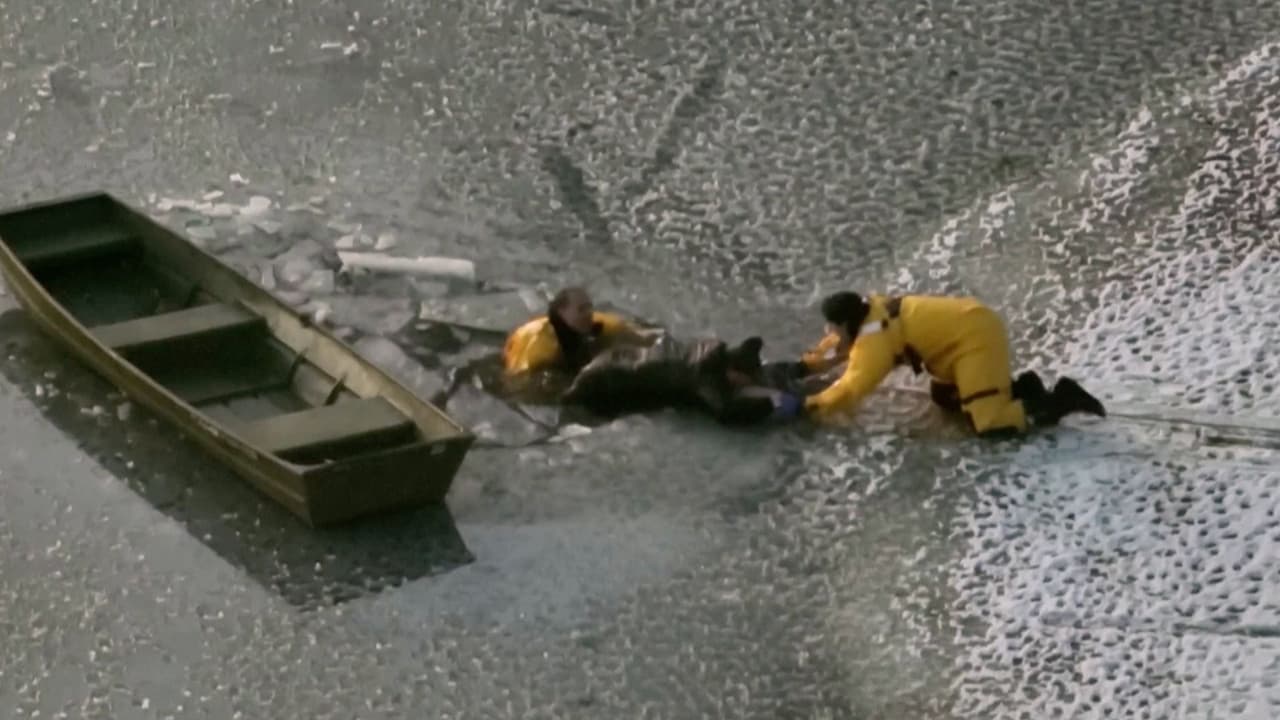 En video: el dramático rescate de un hombre y su perro atrapados en un lago helado