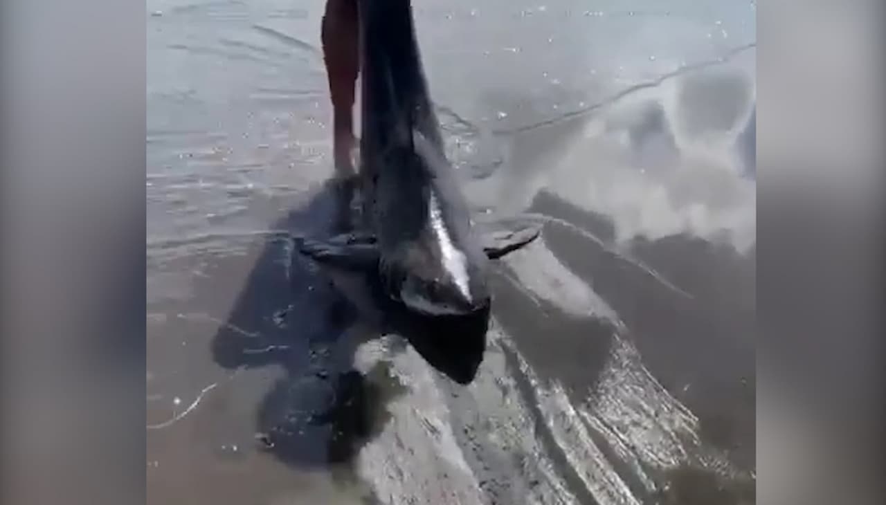 En video: El rescate de un tiburón que quedó varado en una playa al enredarse en una cuerda de pesca