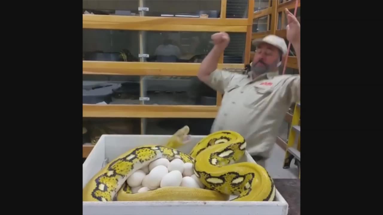 Una tienda de animales en California publicó en sus redes sociales un video de una Pitón que intentó atacar a su cuidador cuando este le quitaba los huevos para protegerlos.