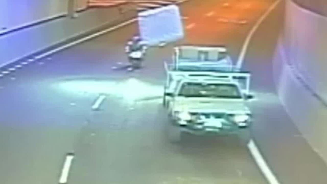 En video: un colchón vuela de un camión y cae sobre un motociclista