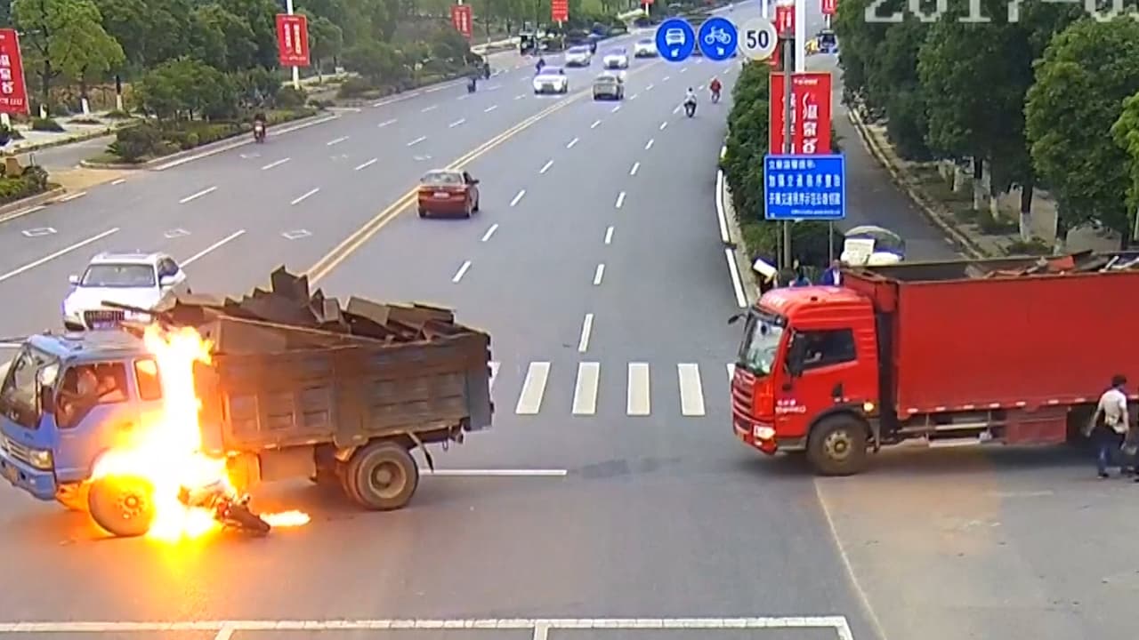 La rápida reacción del conductor salvó la vida de un motociclista que se estrellara contra su camión en una vía de la provincia de Jiangxi, al este de China.