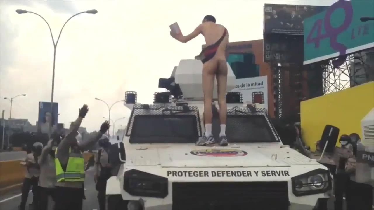 En video: Un joven desnudo escala una tanqueta en las protestas de Venezuela