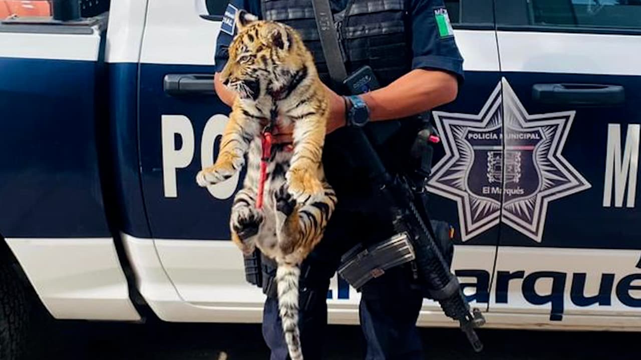 Luego de un incidente de tránsito, una pareja fue detenida por policías del estado de Querétaro tras actuar agresivamente e intentar darse a la fuga. En el interior de su vehículo encontraron un cachorro de tigre, además de cuatro armas y 98 cartuchos de bala.