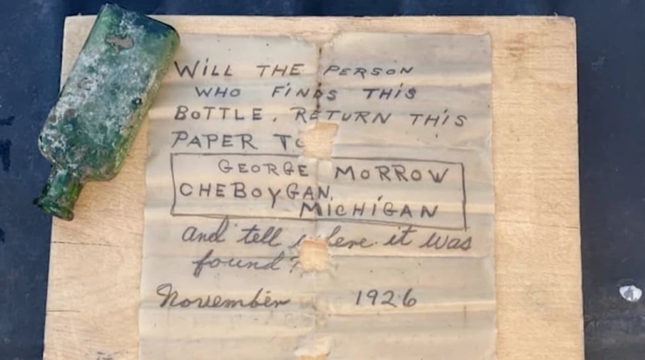 Una nota escrita por un hombre hace 95 años fue encontrada dentro de una botella en el fondo de los Grandes Lagos, cerca de la costa de Cheboygan, Michigan. En ella se pedía que el papel fuera devuelto a George Morrow y estaba fechado en 1926. Aunque el hombre ya había fallecido, su hija recibió el mensaje escrito por su propio padre más de nueve décadas atrás.