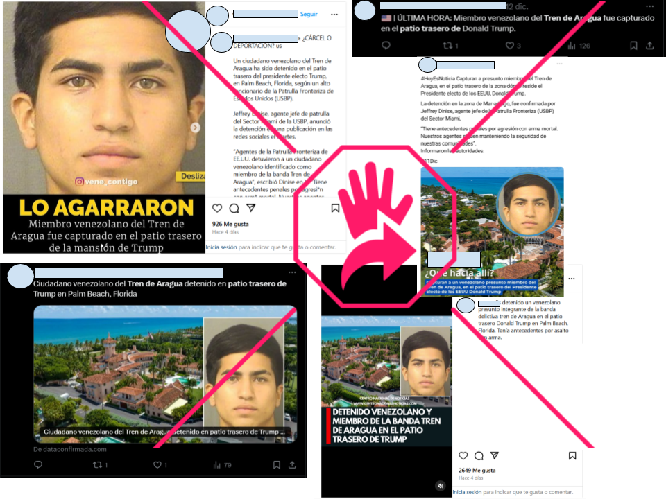 Es engañosa la afirmación que circula viralmente en redes sociales de que la policía de Florida detuvo a un miembro de la banda delictiva venezolana “ Tren de Aragua” en “el patio trasero” de la mansión del presidente electo, Donald Trump, en Palm Beach, Miami.