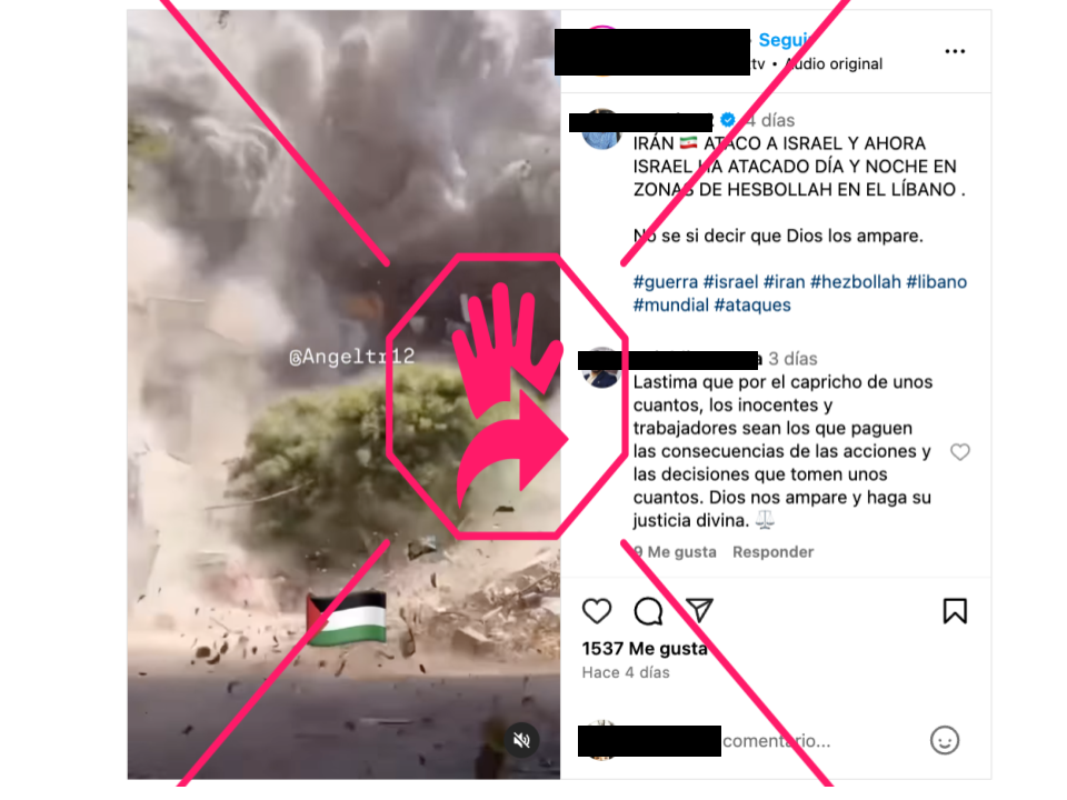 En Instagram circula un video que muestra dos bombardeos en zonas residenciales para afirmar que ambos ataques fueron ejecutados por Israel en Líbano, pero eso es engañoso. La secuencia que aparece al inicio está fuera de contexto, pues lo que muestra es un ataque de Israel en Gaza que tuvo lugar a finales de agosto de 2024 y no está directamente relacionado con el conflicto entre Israel y Líbano.