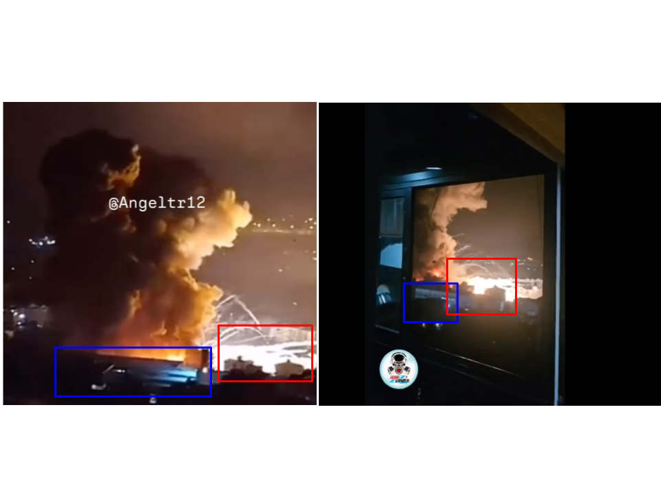 Uno de los resultados que arrojó la búsqueda fue un reporte del medio ruso Pravda del 28 de septiembre de 2024 que muestra una grabación del mismo bombardeo nocturno que circula en Instagram, pero vista desde otro ángulo. En ambas grabaciones se puede ver un edificio alumbrado con una luz azul y dos estructuras que parecen ser tanques de agua cerca de donde ocurre la explosión. Además tras analizarlo detenidamente, confirmamos que el sonido de las detonaciones es el mismo.