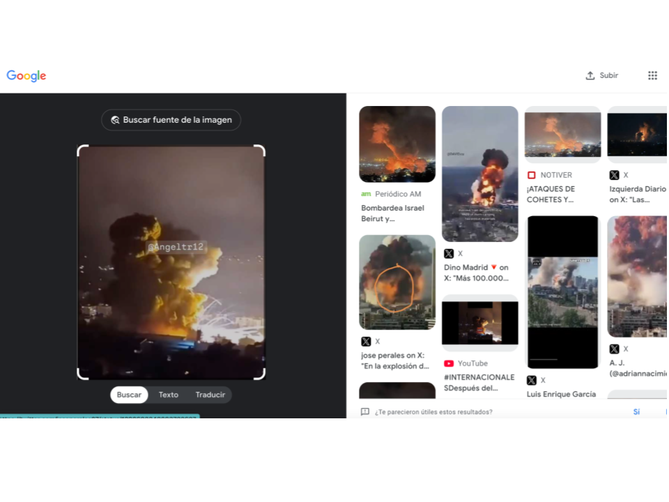 Con otra captura de pantalla, pero ahora del segundo clip del video chequeado, realizamos una nueva búsqueda inversa de imágenes y confirmamos que éste sí muestra un ataque en Líbano.