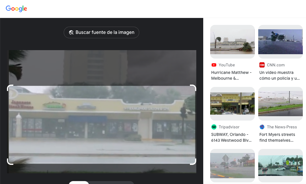 Sin embargo, una búsqueda inversa de imagen realizada en Google por elDetector nos permitió encontrar un video en YouTube en el que se pueden ver las mismas imágenes sin ningún tornado en la parte posterior. El tronco de la palmera caída en el suelo en primer plano y los letreros de las tiendas permiten identificar que se trata de la misma grabación, que fue hecha en esta dirección de Jacksonville Beach, en Florida, según pudimos localizar.