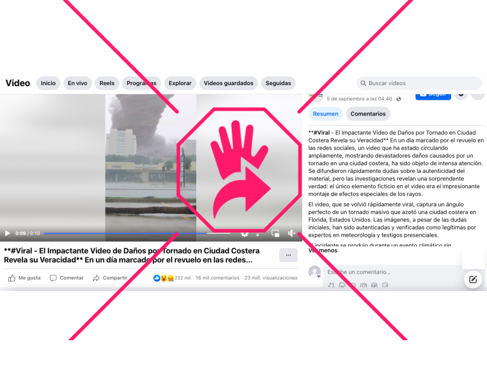 “El video, que se volvió rápidamente viral, captura un ángulo perfecto de un tornado masivo que azotó una ciudad costera en Florida, Estados Unidos. Las imágenes, a pesar de las dudas iniciales, han sido autenticadas y verificadas como legítimas por expertos en meteorología y testigos presenciales”, asegura el texto que acompaña la grabación en Facebook. La publicación, que suma 23 millones de visualizaciones hasta el 13 de septiembre, dice también que “la única parte del video que resultó ser una obra de arte del CGI (Computer-Generated Imagery) fueron los espectaculares rayos que iluminan el cielo tormentoso”, pero que los mismos “no afectan la veracidad de la grabación en general”.