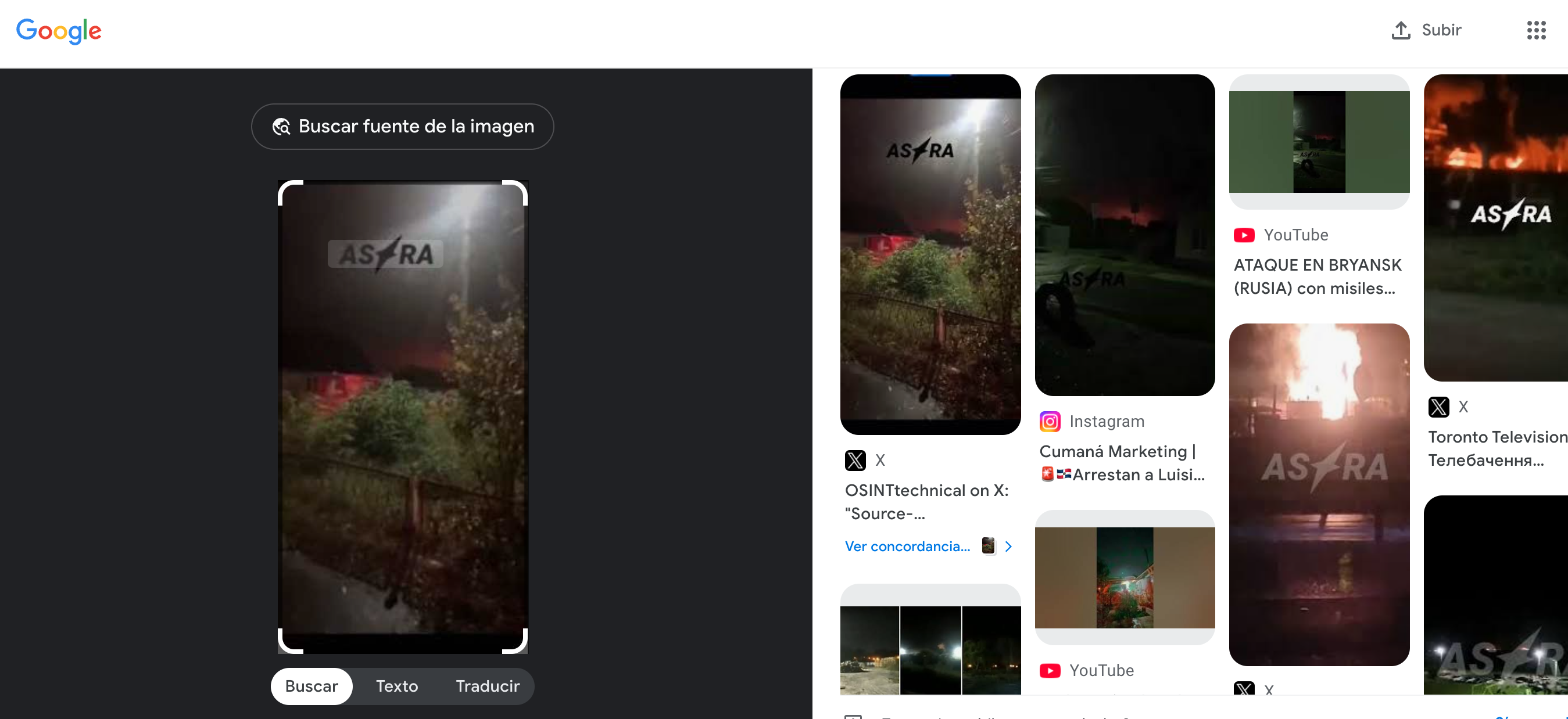 Los tres videos tienen sobrepuesto el logo de Astra y tras revisar la secuencia que se ha compartido en redes en noviembre de 2024 podemos ver que el texto con la afirmación falsa de que se trata de un ataque de Ucrania a Rusia con misiles estadounidenses tapa ese gráfico. Pero en realidad se trata de los mismos videos.