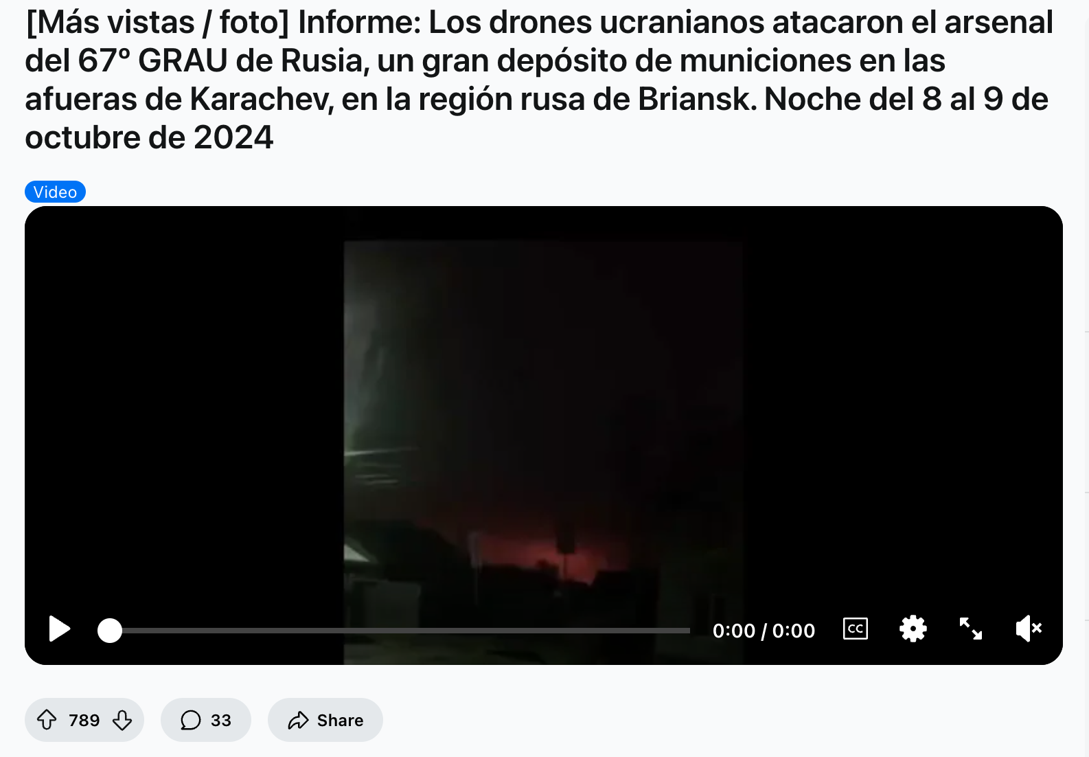 “Los drones ucranianos atacaron el arsenal del 67º GRAU de Rusia, un gran depósito de municiones en las afueras de Karachev, en la región rusa de Briansk. Noche del 8 al 9 de octubre de 2024”, dice el mensaje que acompaña el video.