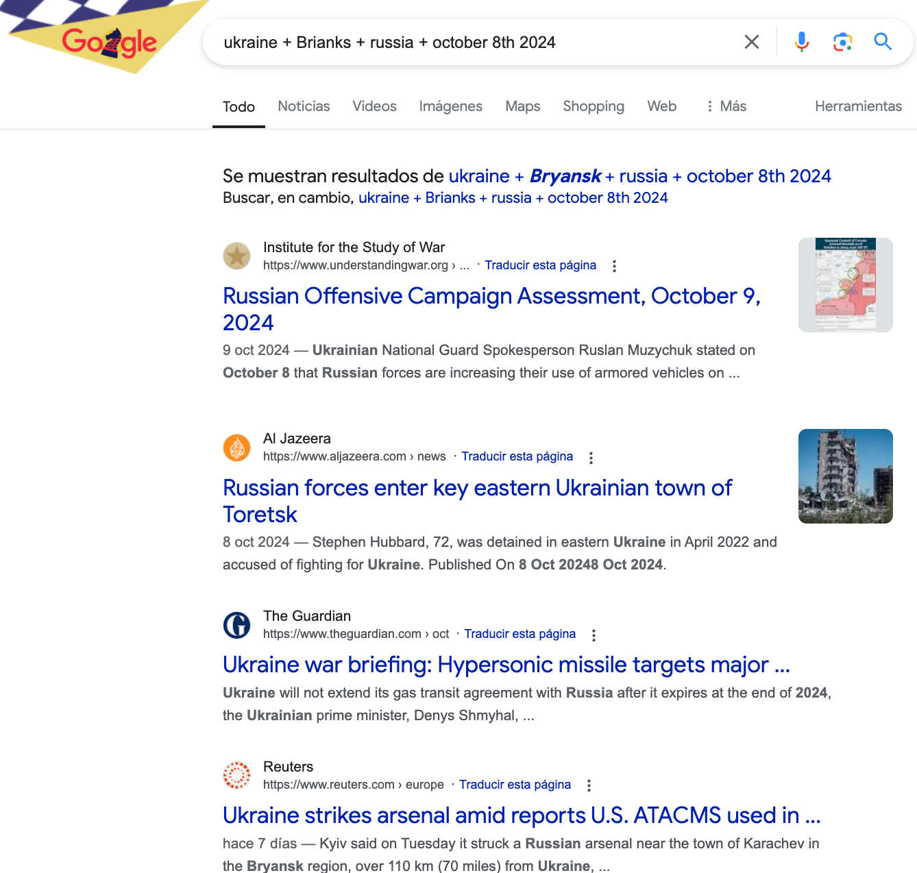 Hicimos una búsqueda con palabras clave en Google y encontramos reportes de medios que informaron que el 8 de octubre de 2024 alrededor de 24 drones fueron derribados sobre la región fronteriza suroccidental de Briansk, y otros tantos en las regiones de Belgorod, Kursk, Rostov y Krasnodar y en las aguas del Mar de Azov.