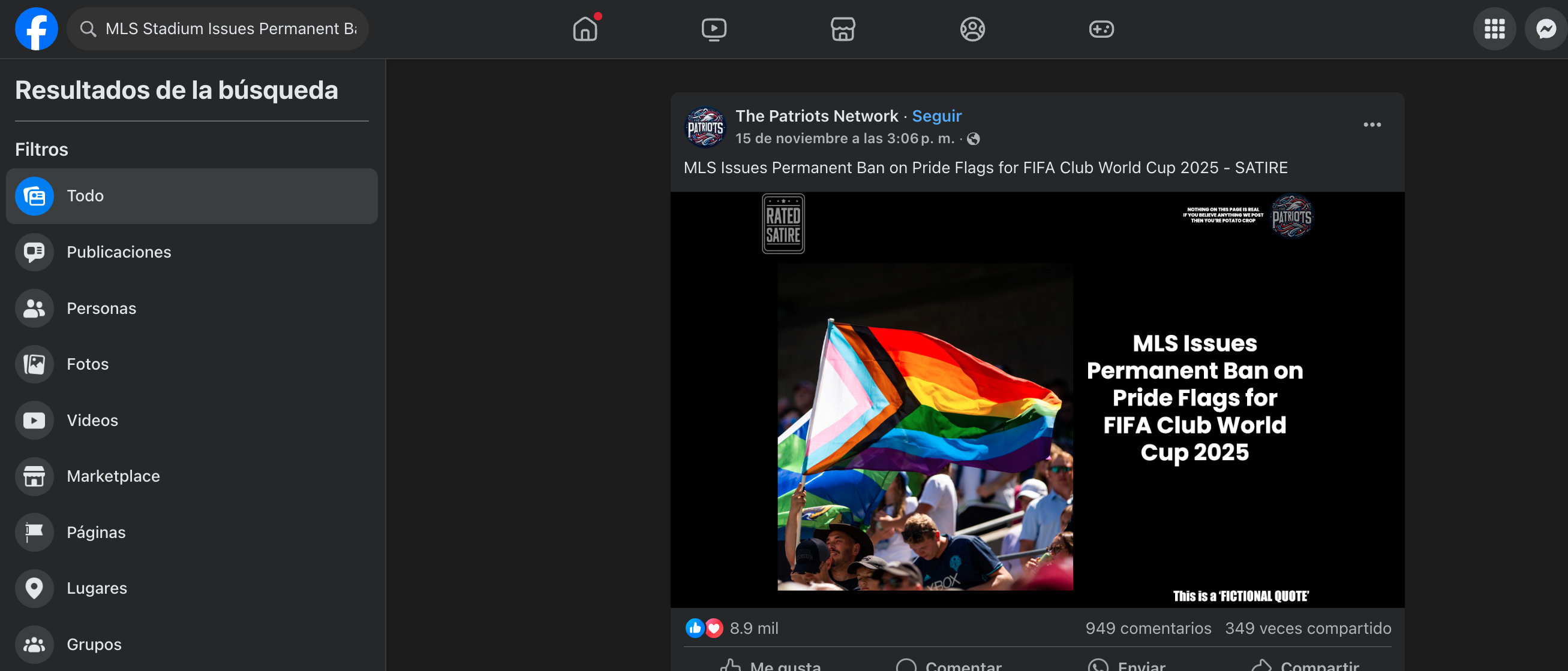 Después realizamos una búsqueda en Facebook con palabras clave y encontramos una publicación de The Patriotics Network , una página que publica contenido de sátira, del 15 de noviembre de 2024 que dice, en inglés: “La MLS prohíbe permanentemente las banderas del orgullo gay en el Mundial de Clubes de la FIFA 2025 - Sátira”.