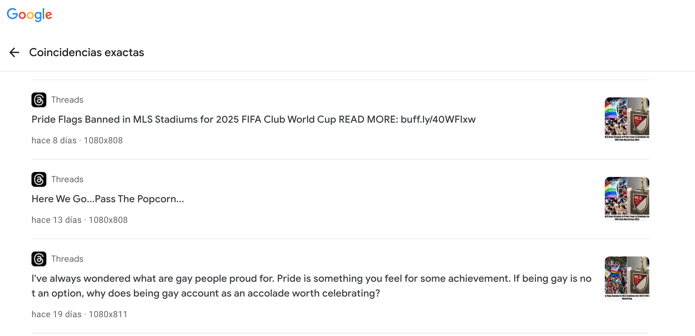 Hicimos una búsqueda inversa de imagen en Google Lens y encontramos que publicaciones con la misma afirmación sobre la prohibición de la bandera LGBTQ en los estadios de la MLS ya habían circulado en inglés.