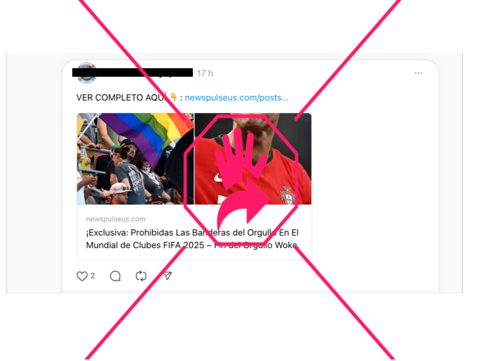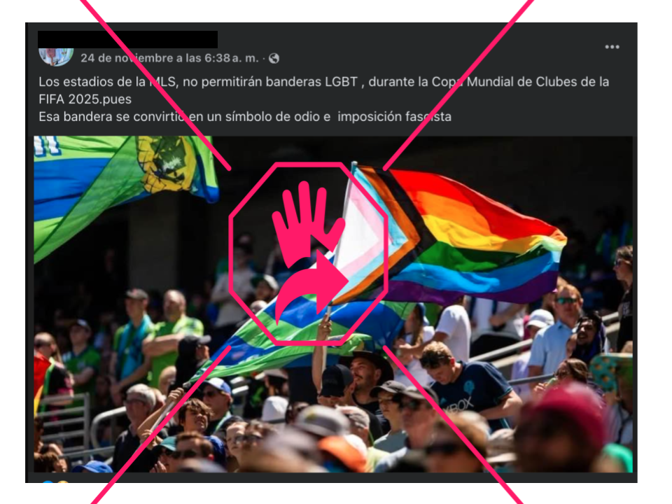 “Los estadios de la MLS, no permitirán banderas LGBT[Q+], durante la Copa Mundial de Clubes de la FIFA 2025 pues esa bandera se convirtió en un símbolo de odio e imposición fascista”, dice un mensaje en Facebook que incluye una fotografía de lo que parece ser una marcha del orgullo gay.