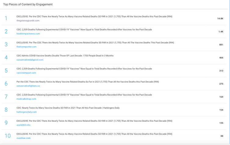 Entre los días 29 de marzo y 9 de abril, al menos 10 "noticias" publicadas en páginas de Estados Unidos se viralizaron en las redes sociales con titulares como: "Según los CDC el número de muertes relacionadas con las vacunas este año es casi el doble de lo registrado en la última década" (" Per the CDC There Are Nearly Twice As Many Vaccine Related Deaths So Far in 2021 Than All the Vaccine Deaths this Past Decade", en la versión en inglés)