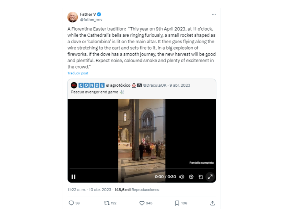 El video y los detalles los publicó el padre Vierling el 9 de abril de 2023 en su cuenta en X (antes Twitter). Esa grabación es la misma que circula en Threads, Facebook e Instagram y que acá estamos verificando. El ritual que se grabó se llama “El Scoppio del carro” o “La explosión del carro” y se realiza cada domingo de resurrección en Florencia, según explica The Huffington Post .