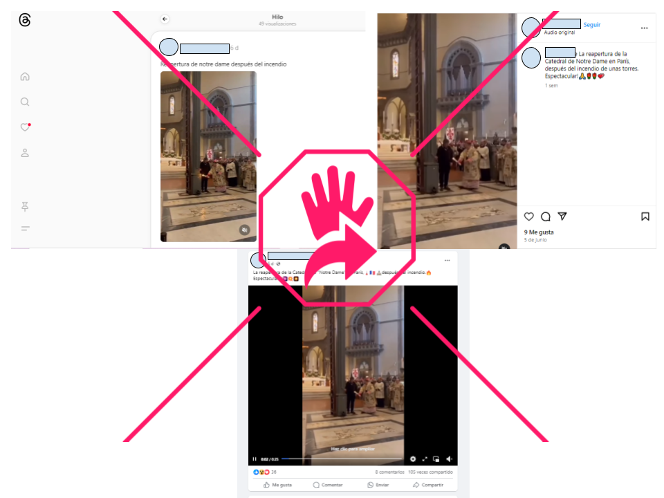 En Threads, Facebook e Instagram circula un video que afirman es de la “reapertura de Notre Dame”, el templo francés que quedó devastado tras un incendio el 15 abril de 2019. Pero es falso que sea en Notre Dame esa grabación en la que se ve un reducido grupo de personas, entre ellas un religioso con un cirio en la mano que enciende un dispositivo situado en una columna de la iglesia y hace que salga volando una especie de pirotecnia por la puerta.