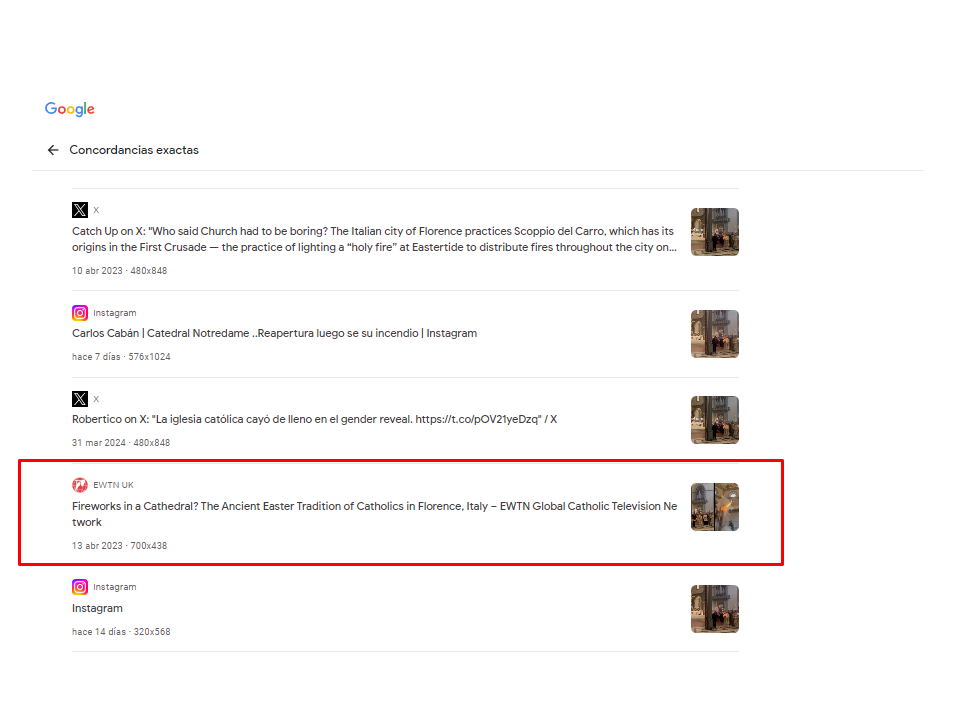 Con una captura de pantalla del video que circula en redes sociales, hicimos una búsqueda inversa de imágenes en Google Lens. Los resultados, en sus concordancias exactas, nos llevaron a dos artículos: uno en una web católica y otro de The Huffington Post, en los que está el video y la explicación de que es una “antigua tradición florentina”.