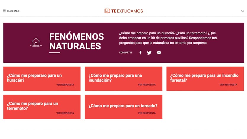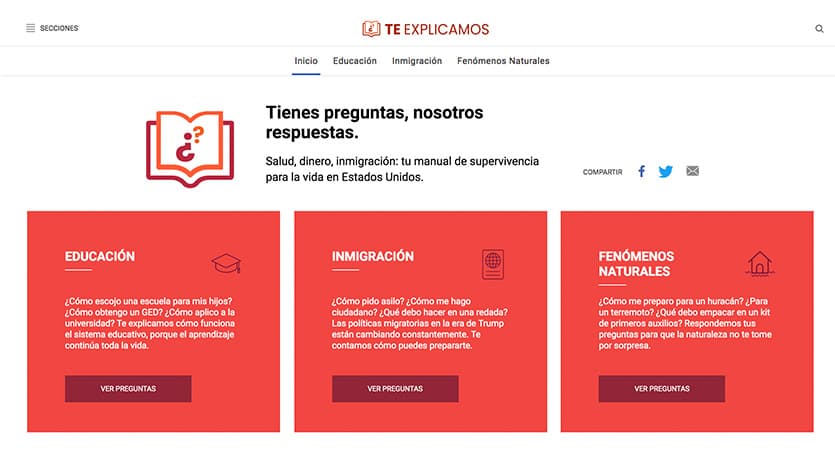 Nuestro contenido de educación, inmigración y fenómenos naturales es apenas el comienzo de este proyecto de largo aliento, así que las preguntas que nos envíen ustedes los lectores y los comentarios que hagan en nuestras redes sociales serán vitales para el crecimiento y el éxito de esta herramienta para la comunidad.
