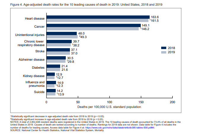 Fue el 22 de diciembre de 2020 cuando los CDC presentaron las estadísticas de las muertes registradas en Estados Unidos de 2019, el año que no había aparecido la covid-19 ¿Qué muestran? Que los infartos, el cáncer y las lesiones no intencionales (accidentes de tránsito, intoxicaciones, ahogamientos, lesiones por armas de fuego, caídas y quemaduras) se mantuvieron inamovibles en 2018 y 2019 como las tres primeras causas de muerte en Estados Unidos.