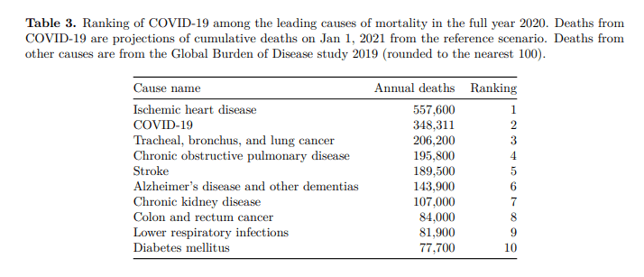 Si revisamos, en cambio, las proyecciones del IHME en 10 meses del 2020 (marzo a diciembre), l as enfermedades coronarias sí aparecen en primer lugar, y la covid-19 en segundo en el mismo ranking de 10. En el cuadro estadístico, el IHME explica que estos cálculos anuales son proyecciones de las muertes acumuladas por covid-19 desde marzo (cuando se declaró la pandemia) hasta el 1 de enero de 2021.
