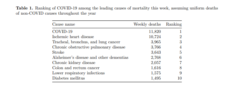 Sin embargo, un centro de investigación independiente de la salud como el Instituto de Métricas y Evaluación de la Salud (IHME por sus siglas en inglés), de la Universidad de Washington, ya llegó a algunas conclusiones propias. El 4 de diciembre de 2020 publicó un ranking en el que la covid-19 se alza como la principal causa de muerte en Estados Unidos, pero por número de casos semanales en el periodo en el que publicaron estas cifras. Aquí la enfermedad del coronavirus lidera la lista de las 10 enfermedades más mortales esa semana. Los ataques de corazón aparecen en segundo lugar. Y les siguen el cáncer de tráquea, pulmón y bronquios, enfermedades pulmonares obstructivas crónicas y derrames, Alzheimer y otras demencias, enfermedad renal crónica, cáncer de colon y recto, infecciones respiratorias inferiores y diabetes.