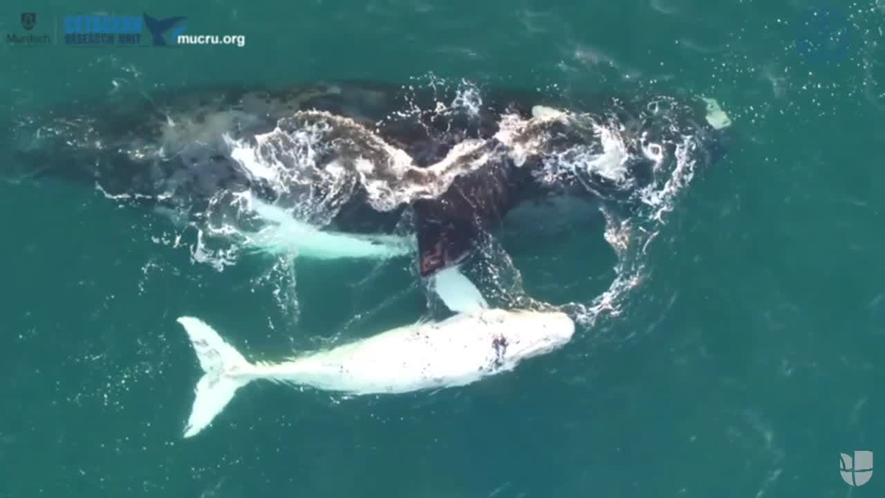 Un dron que grababa la costa de Australia capturó la intimidad de una ballena blanca bebé de unos 15 pies junto a su madre.
