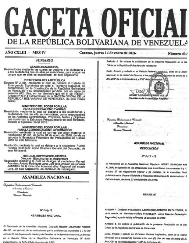 "Se declara el estado de emergencia económica en todo el territorio nacional de conformidad con la Constitución de la República Bolivariana de Venezuela y su ordenamiento jurídico, por un lapso de sesenta días (60)", dice el texto publicado en la gaceta, el órgano de información oficial del Estado venezolano.