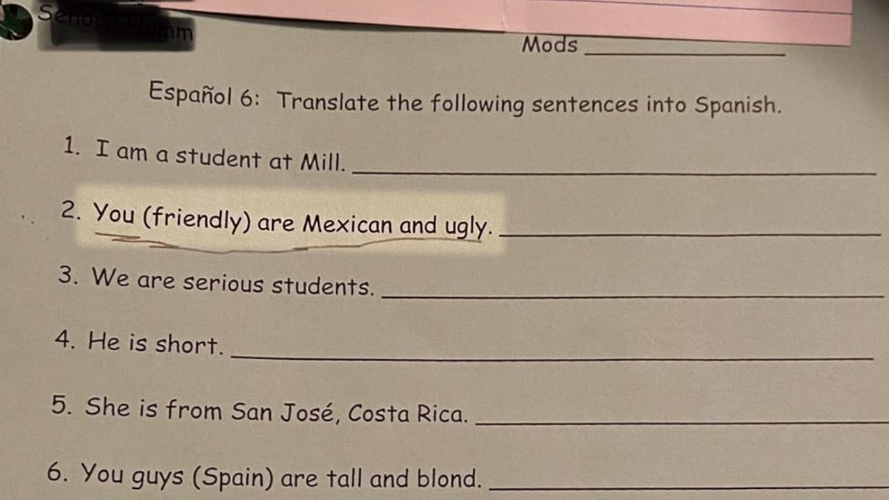 "Tú eres mexicano y feo. Tú eres bonito y estadounidense", puede leerse en el ejercicio de español (está escrito en inglés para que los alumnos lo traduzcan), cuya fotografía circula por medios y redes sociales después de que algunos padres hicieran públicos su preocupación y su malestar al respecto.