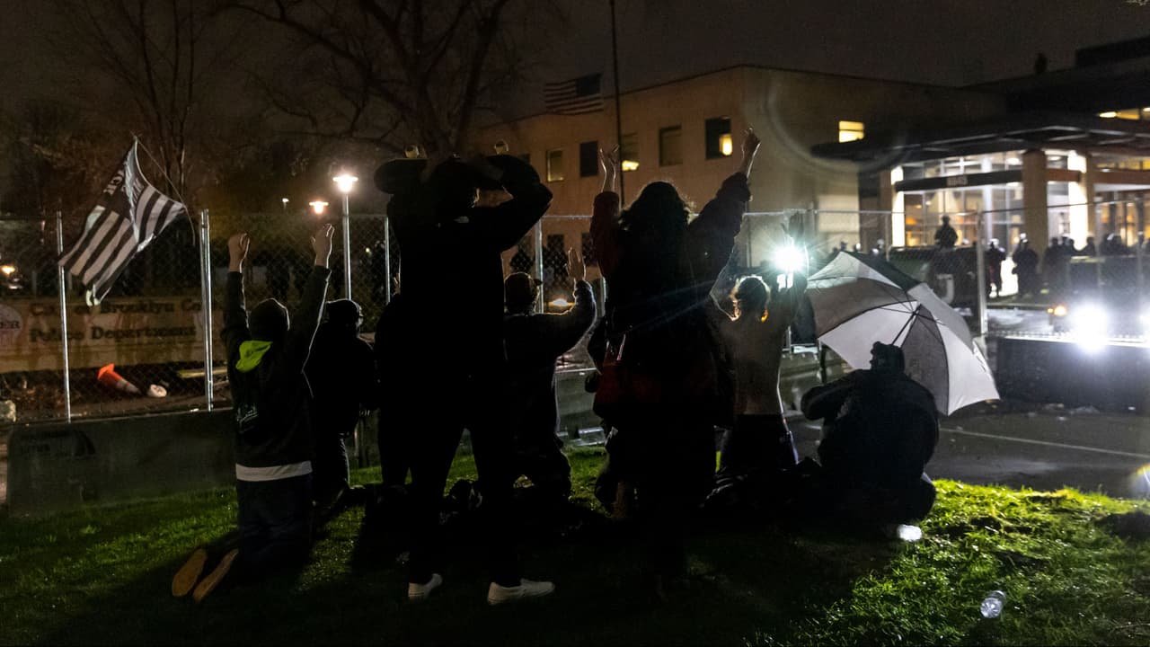 Tras el tiroteo del domingo, cientos de manifestantes marcharon hacia la estación de policía de Brooklyn Center, donde agentes con equipo antimotines formaron una línea protectora y lanzaron