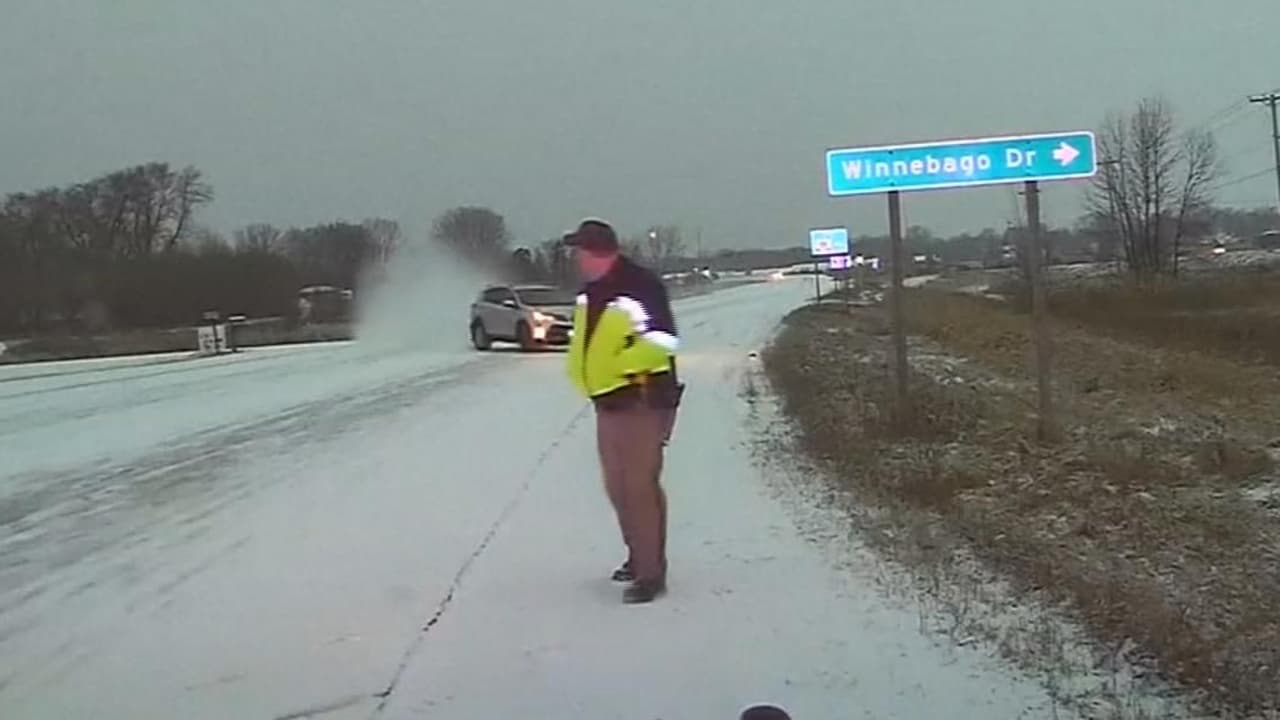 El invierno ha hecho más complejo el cumplimiento de las labores de los oficiales de la policía de Wisconsin que arriesgan su vida en medio de las condiciones extremas de la temporada donde las vías se congelan por completo. El oficial Jason Fabry, quien estaba ayudando a un conductor que se deslizó dentro de una zanja, vivió la experiencia de encontrarse frente a un auto que patinaba sobre el asfalto.