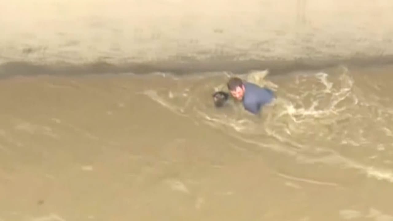 Dustin Leming no dudó en actuar cuando se dio cuenta de que un perro se encontraba en peligro. El pastor alemán batallaba para no ahogarse en un río de Los Ángeles durante una tormenta. Más noticias aquí.