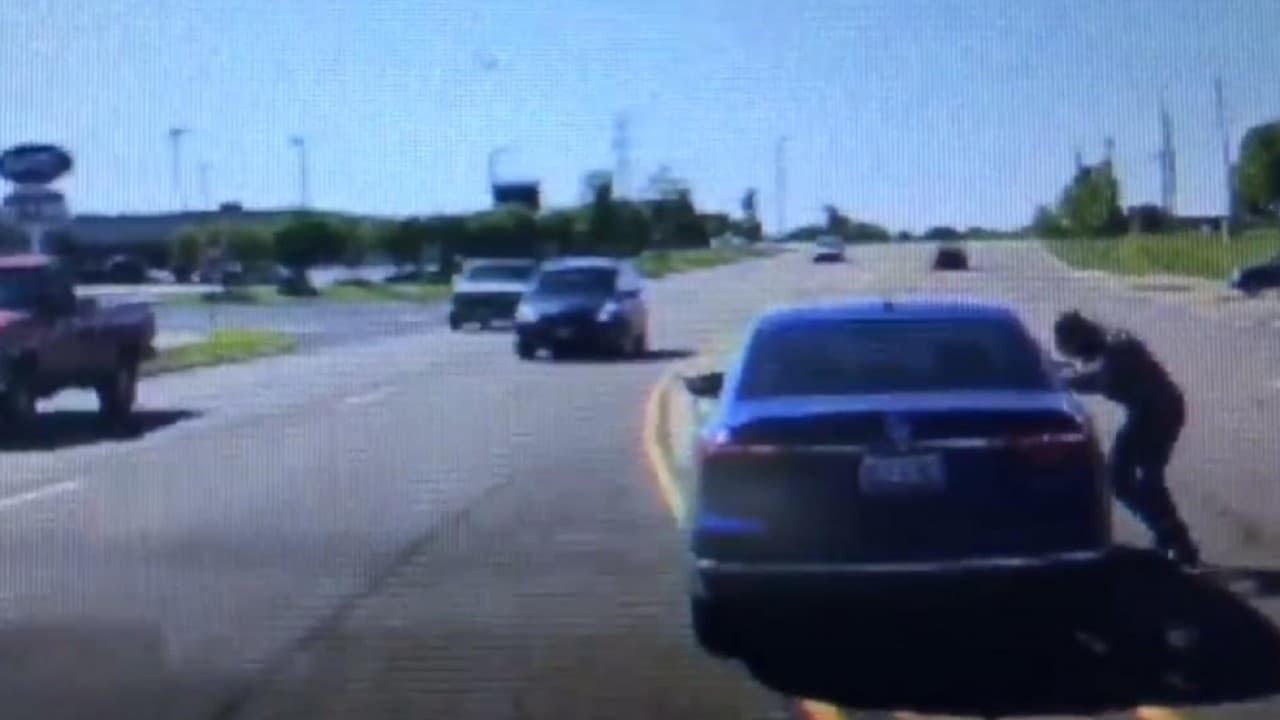 Una cámara del auto de la policía de Dixon captó el heroico gesto del hombre, quien saltó dentro del auto en movimiento para salvar a un extraño en apuros.