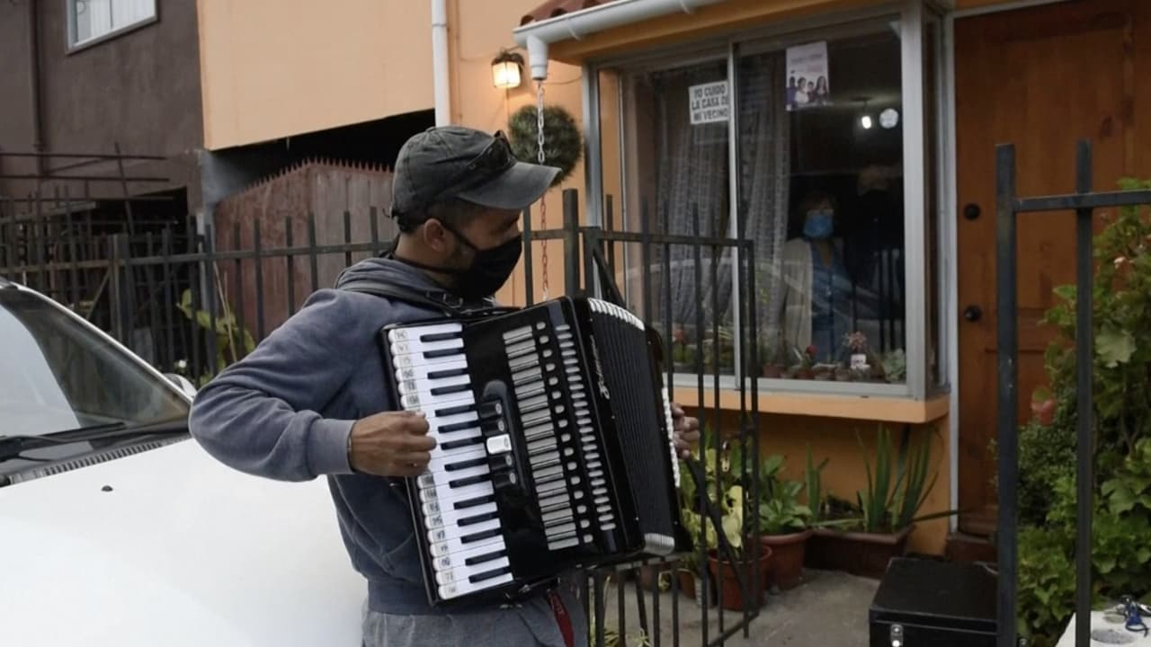 Mientras dos ancianos permanecen solos y confinados su casa para evitar contagiarse con el coronavirus, su hijo, un acordeonista chileno de la ciudad costera de Hualpen, utiliza todo su talento para alegrar el espíritu de sus padres.