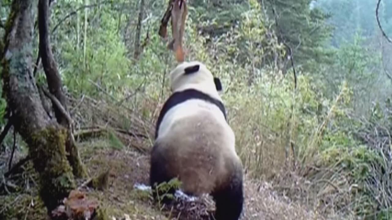 Con cámaras ocultas se pudo grabar el momento en el que un panda en una reserva natural se acercó a inspeccionar un pedazo de tocino colocado en el bosque.
