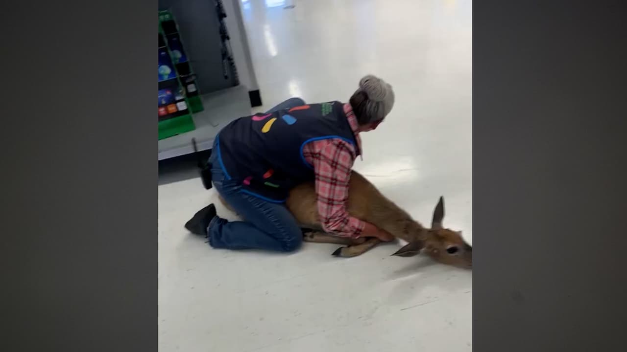 Este venado entró a un Walmart y una intrépida empleada lo abordó y tiró al suelo para sacarlo