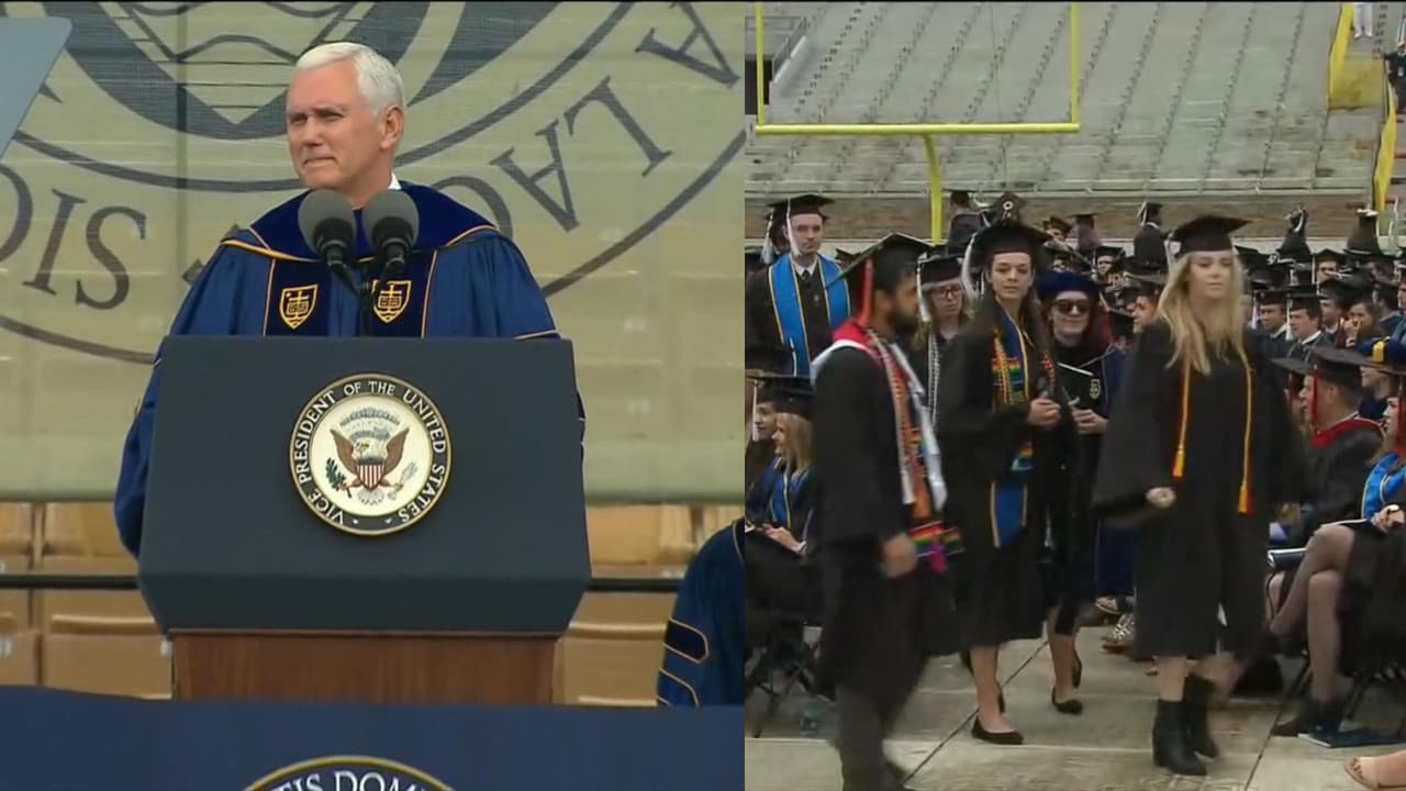 Este domingo, decenas de estudiantes salieron del recinto mientras el vicepresidente Mike Pence ofrecía el discurso oficial en un acto de graduación de la Universidad de Notre Dame.