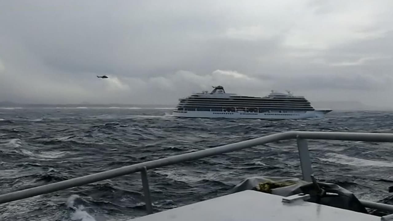 Helicópteros de rescate y pequeñas embarcaciones rescataron a los pasajeros de la nave, que sufrió una falla de motor en medio de fuertes condiciones climáticas en la costa oeste de Noruega.